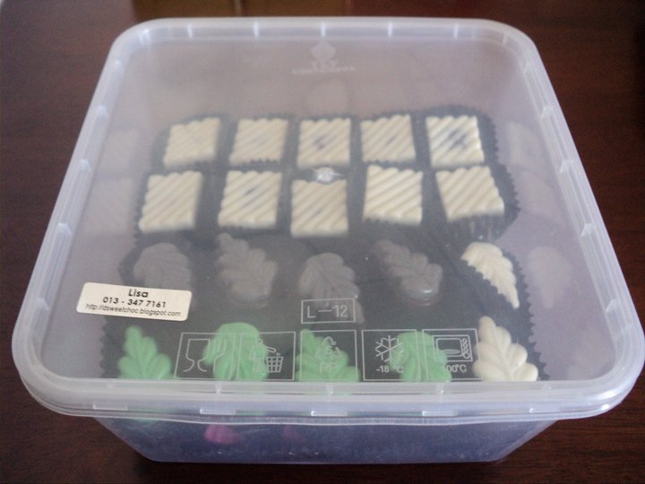 Tempahan ni dari Pija, kakak Pizan.. Pija dtg umah utk tgk contoh2 coklat, ingatkan nak tgk jer dulu tup2 terus tempah coklat praline promosi 100pcs dgn gift utk hantaran. Berkungfu la Lisa menyiapkan order mengejut Pija sbb Pija nak sehari seblm Raya Haji aritu.. Apa2pun Lisa happy menyiapkan order Pija ni heheh. Terima kasih byk ye Pija. Lenkali order lg erk..